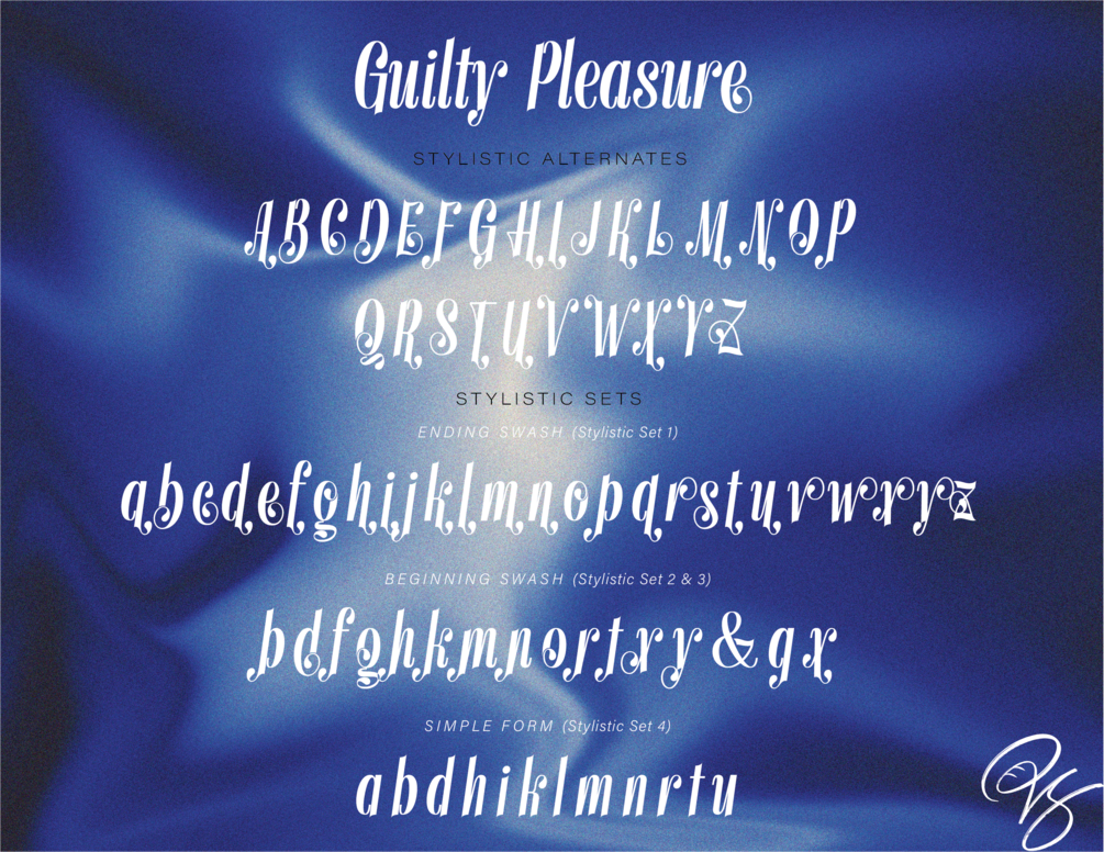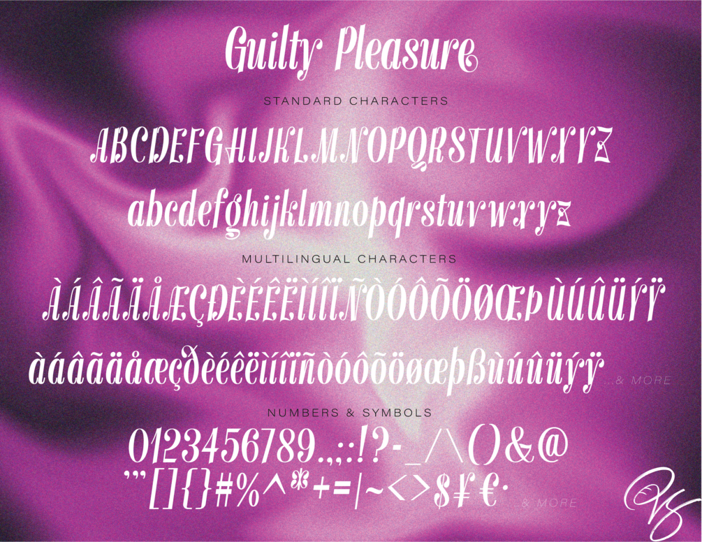 Meet the display serif font that whispers luxury, teases elegance, and leaves a lasting impression. Guilty Pleasure is your secret indulgence — bold, stylish, and oozing with sophistication. Every curve is crafted to tempt, with flowing swashes and sensual alternates that dance off the page.